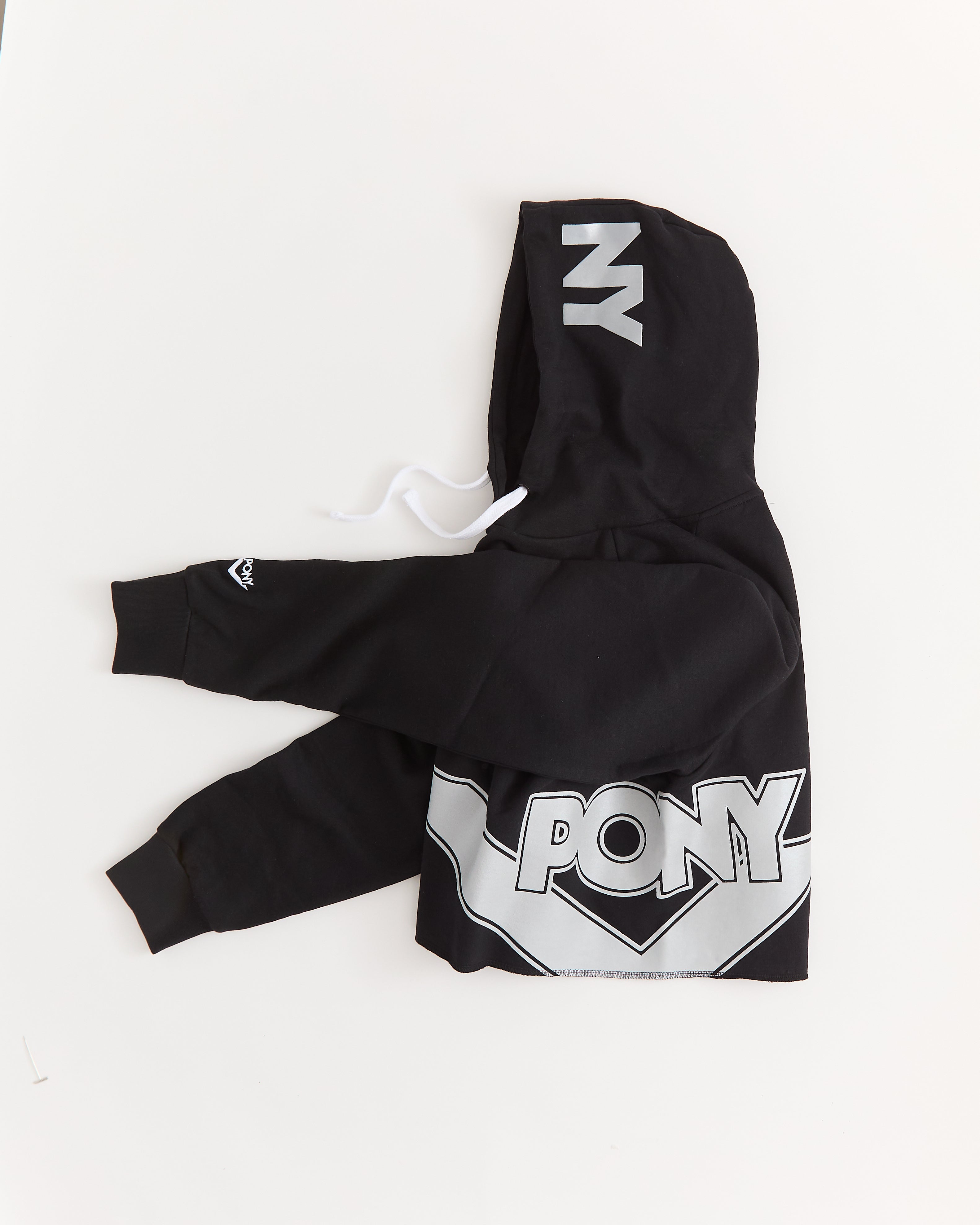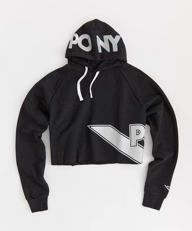 Street-style cropped hoodie in black with oversized PONY branding.. Designed with a drawstring hood, long sleeves, and a bold graphic finish for a street-ready look.